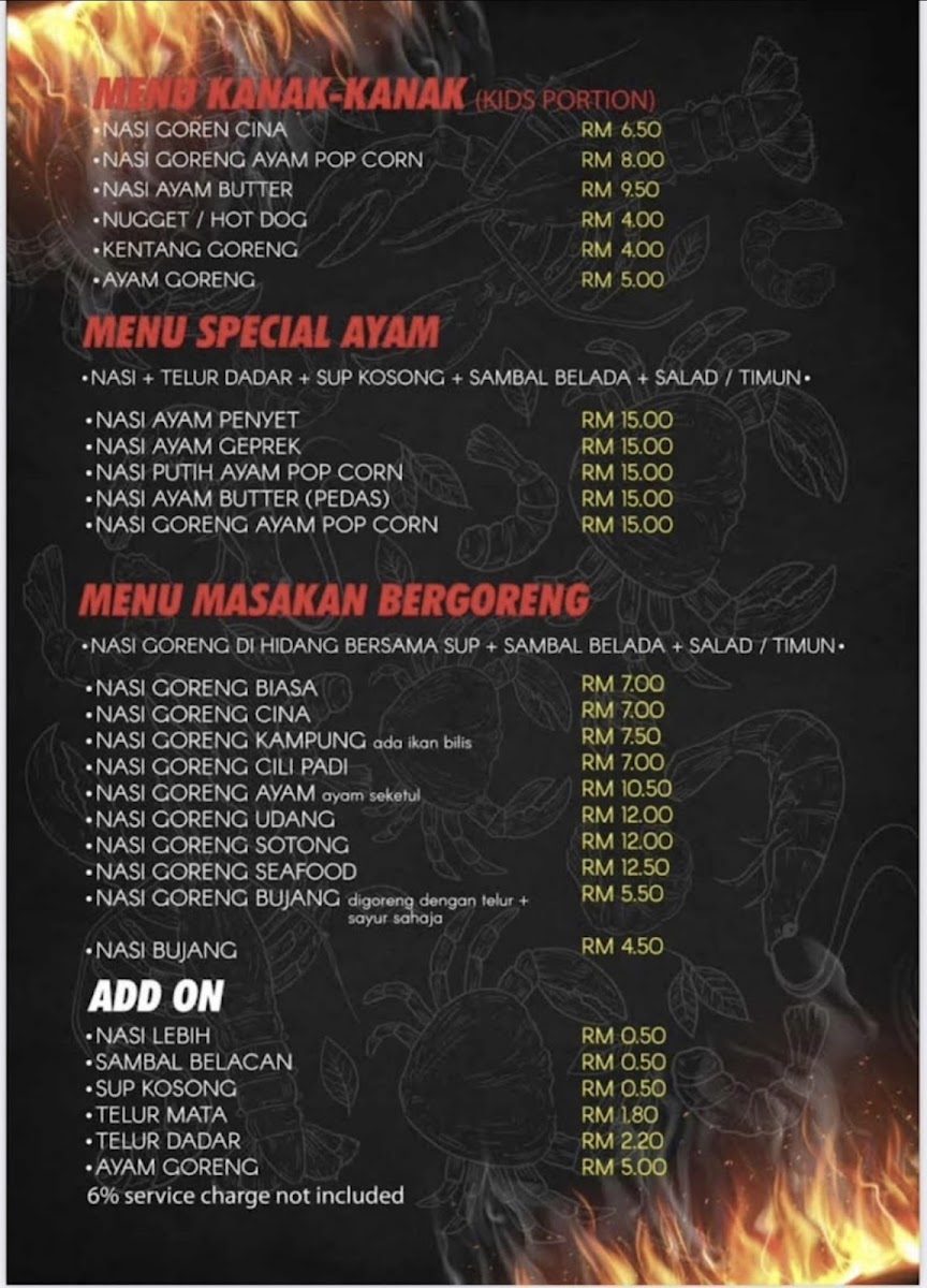 •King Crab Rm 35/100Gram (Anggaran 1.2-1.6Kg) •Lobster Rm 20/100Gram (Anggaran 800G-1Kg) •Mud Crab (Ketam Nipah) Rm 18/100Gram